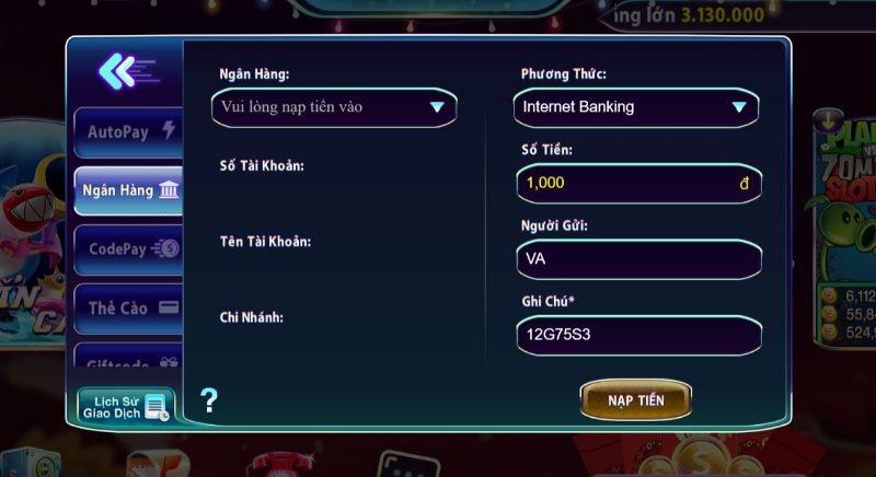 Hướng dẫn nạp tiền qua tài khoản ngân hàng